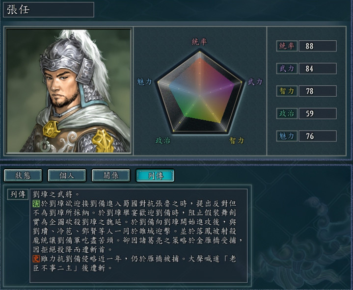 先说说西川四将中的核心战力张任。这位寒门出身的猛将,在游戏中的统武总和达到了172,在整个益州武将中稳居第一,五维总和385更是跻身全游戏311位武将的第30名,妥妥的西川头牌战力。78点的智力足够支撑他单独带兵出征,76点的魅力也让他具备了不错的军心凝聚力,唯独59点的政治值稍显拉胯,但对于一位纯粹的武将来说,这完全不影响他的核心价值。更难得的是,张任情谊高、野心低,完美契合他历史上杀身成仁的忠义形象。