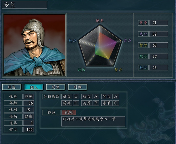 冷苞的兵种适性和刘璝一模一样,都是2A1B3C,戟兵和弩兵双A,但和刘璝不同的是,冷苞拥有一个极强的特技“乱战”。这个特技的效果是所在地形为森时,攻击时必定暴击,也被玩家称为“森神”。它的优势是无视双方武力和攻击力差距,不管对手是吕布、关羽这样的顶级猛将,还是诸葛亮这样的智将,只要进入森林地形,遇到泠苞就得吃瘪。在益州山高林密的地形特点下,冷苞的这个特技简直是为地形量身定做,能充分发挥其强势之处,也算是对他头像拉胯的一种补偿,更对得起他忠义赴死的气节。