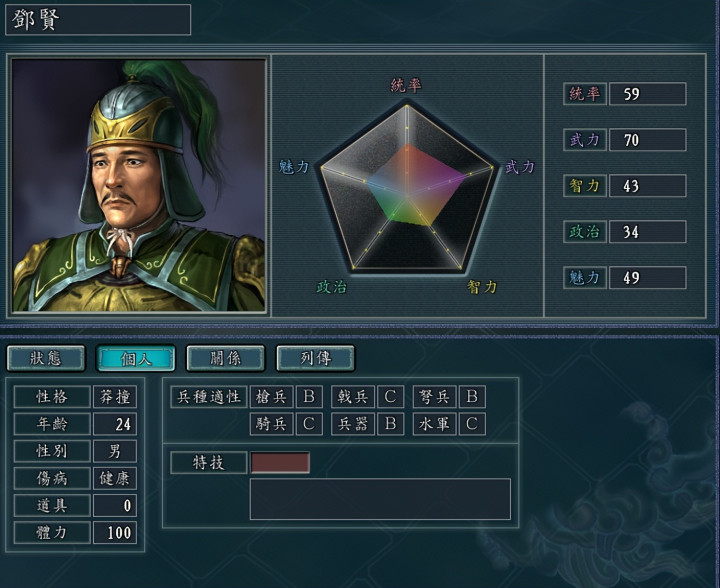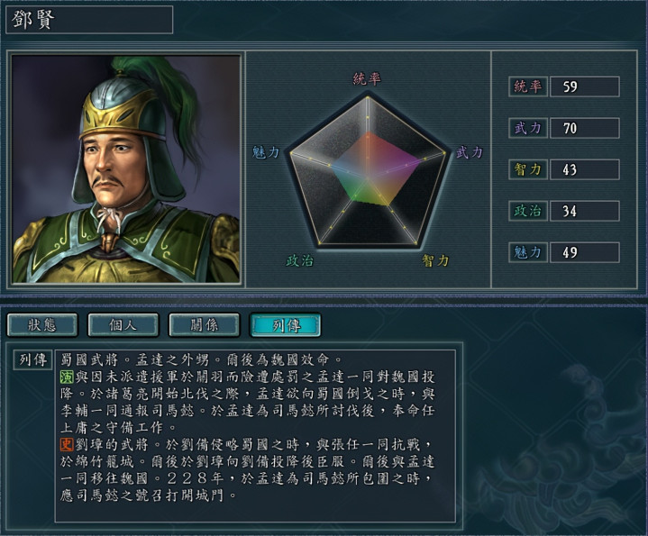 而《三国志11》中并没有单独设置刘璋部下邓贤的角色,只收录了孟达的外甥邓贤,并且将刘璋部下邓贤的部分事迹融合到了他的履历中,所以游戏里的邓贤先是在涪水关抵抗刘备,后来又投降了刘备,导致刘璋部下邓贤的具体游戏数据无从得知。不过这并不影响西川四将的整体形象,毕竟另外三位将领的忠义与实力已经足够让人铭记。