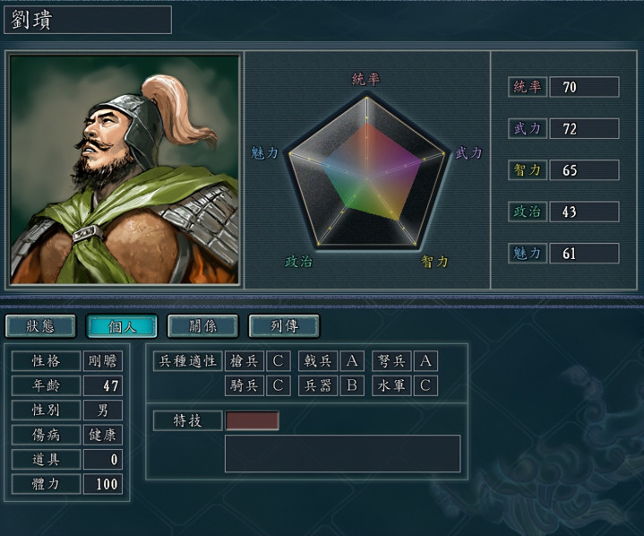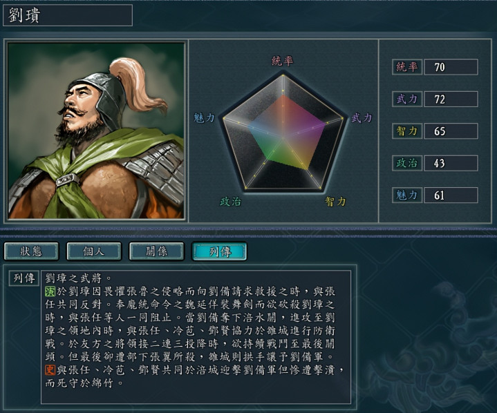 接下来是刘璝,这位同样忠义的将领,游戏数据虽然不如张任亮眼,但也算得上一员合格的战将。统武数据之和144,智力65、魅力61,都属于尚可的水平,只有43点的政治值不达标。兵种适性是2A1B3C,戟兵和弩兵都是A级别,在战场上也能发挥不小的作用。不过比较遗憾的是,刘璝没有任何特技,属于白板武将,这也导致他的知名度远不如张任。