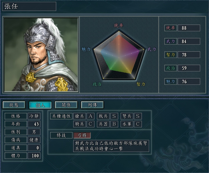 兵种适性方面,张任更是堪称全能,2S1A1B2C的配置在山地作战中优势尽显。戟兵和弩兵双S的顶级适性,搭配他的特技“弓将”,简直是敌军的噩梦。这个特技的核心效果是对武力低于自己的敌部队,弩兵战法成功时必定暴击,足以见得张任的射箭功底有多扎实。