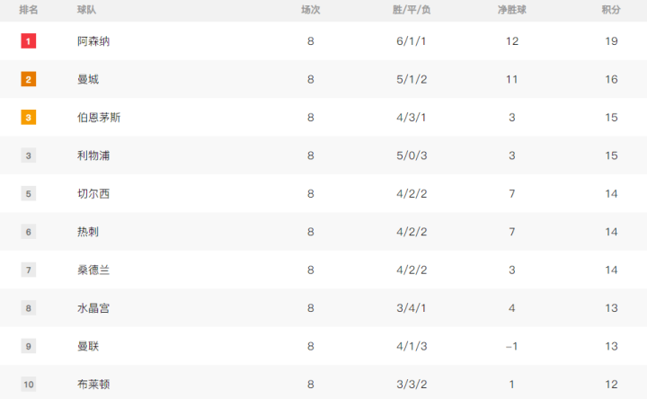 阿森纳、曼城、伯恩茅斯、利物浦、切尔西、热刺、桑德兰、水晶宫、曼联、布莱顿