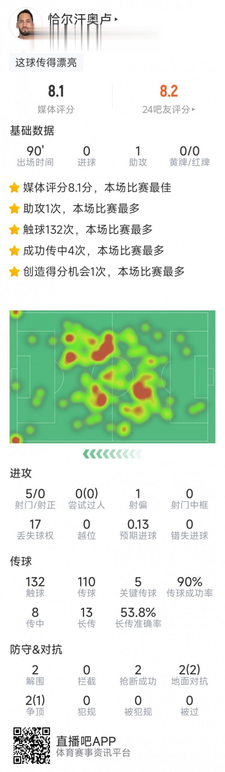 直播吧11月2日讯在本轮意甲,国米2-1击败维罗纳,以下为恰尔汗奥卢本场数据: