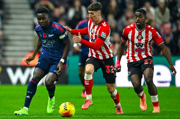 上半场补时阶段,卡拉菲奥里传中,萨卡力压后卫头球摆渡,萨利巴展现后卫脚法,错失良机。