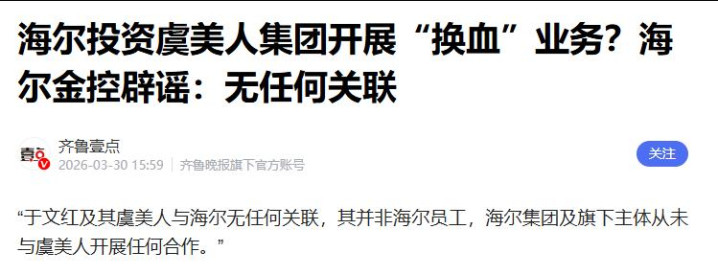 3月30日,海尔发布紧急声明,明确表示于文红及虞美人集团与海尔无任何关联,将通过法律途径从严追责,绝不姑息。
