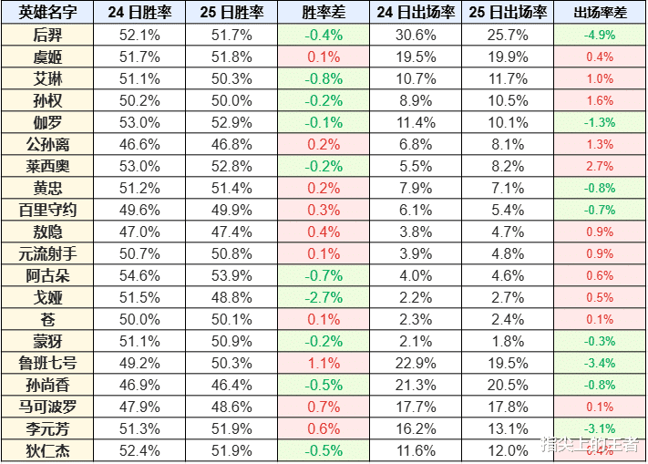 出场率30.6%-25.7%,降幅高达4.9%,出场率52.1%-51.7%倒是影响不大,或许是因为赛季初期,大家压力大,不敢赌后羿的开团能出效果,所以才不玩后羿?