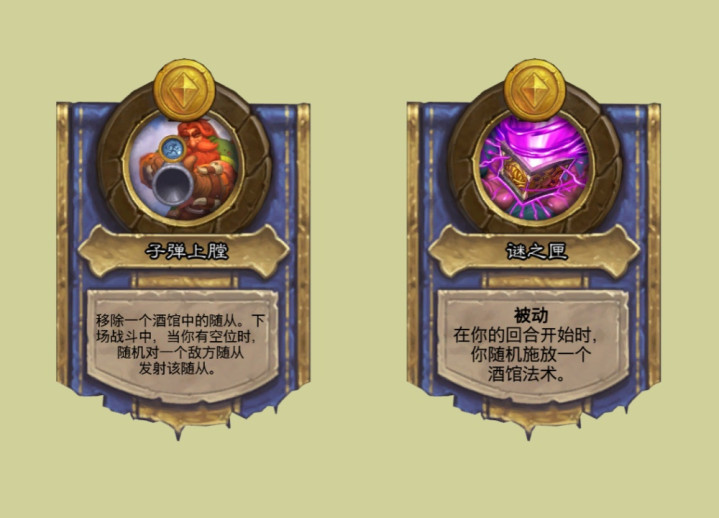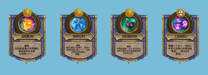 塔维什的技能改成0费移除酒馆里的一个随从,下场战斗中当你有空位时,随机对一个敌方随从发射该随从,感觉技能要配合buff酒馆的体系才好用,而伙伴则能让你获得被移除随从的原始版复制。典狱长的技能改成1费消灭一个友方亡灵随机获取一张亡灵牌,可惜要是发现就更好了。尤格萨隆的技能改成你的回合开始时,随机施放一个酒馆法术,这下真是导演了。费林的技能发现顺序从2,4,6改成了6,4,2,这项优化可以让你先发现六本核心,然后再决定2费和4费拿什么随从,挺人性化的改动。