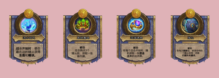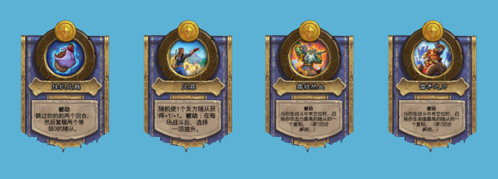 布鲁坎的技能里的流水祈咒效果改成战斗开始时,使最右边的随从获得圣盾和嘲讽,圣盾可比+3生命值强多了。狂风之翼的西部荒野航线,改为1回合后随机获取一张消耗1枚铸币的酒馆法术牌,这里面有蛮多理财法术的。凯尔萨斯的技能改成在你购买3个随从后,获取一张铸币牌。瓦丝琪的技能改成被动,在每个回合开始时,随机获取一张塑造法术的法术牌,但可惜永久效果没有了。强化机器人的被动现在可以使酒馆里的随从获得潜行或烈毒了,这下潜行瑞文又可以玩到了。
