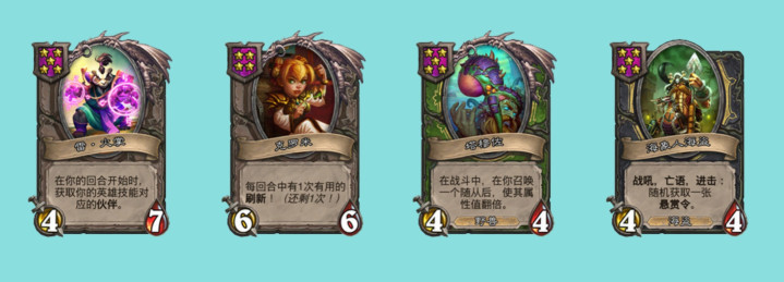 阮大师的伙伴之前很废,改版后变成了5星4/7,在你回合开始时,提供你技能对应的伙伴,这让你在选择技能的时候可以多一种策略方向。诺兹多姆的伙伴让你每回合有一次有用的刷新,有点像神奇的智慧球。厄祖玛特的伙伴改版之后感觉好强,有点像当年的猿神,而且不仅能配合技能召的触须,还能配合野兽机械等种族。帕奇斯的伙伴也顺应海盗种族玩法的改动,改成了战吼亡语进击都能获得一张随机的悬赏令。