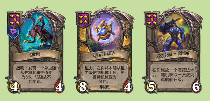阿塔尼斯的伙伴是普罗比斯,磁力,贴给机械随从后可以使那个机械随从变成金的,这个伙伴最厉害的是配合b-box可以一次性点金多个机械。刀锋女王凯瑞甘的伙伴是断角,5星4/4,发现一个异虫随从并将其属性值变为6/6,该随从不会变异,不知道这个发现受不受到凯瑞甘技能等级的限制,场上的异虫变异后能不能和发现的异虫随从三连,有玩到的小伙伴可以说一下。吉姆·雷诺的伙伴是泰凯斯·芬利,5星5/6,当你释放一个酒馆法术后,随机获得一张战列舰升级,没有限制次数,感觉很厉害,就是星级有点高了。