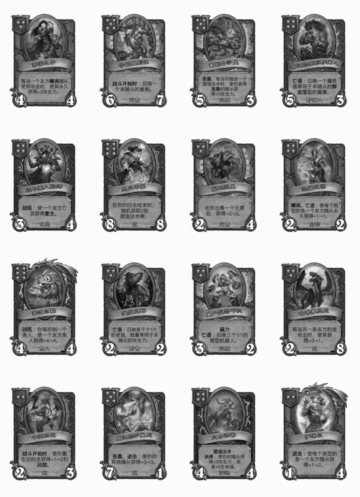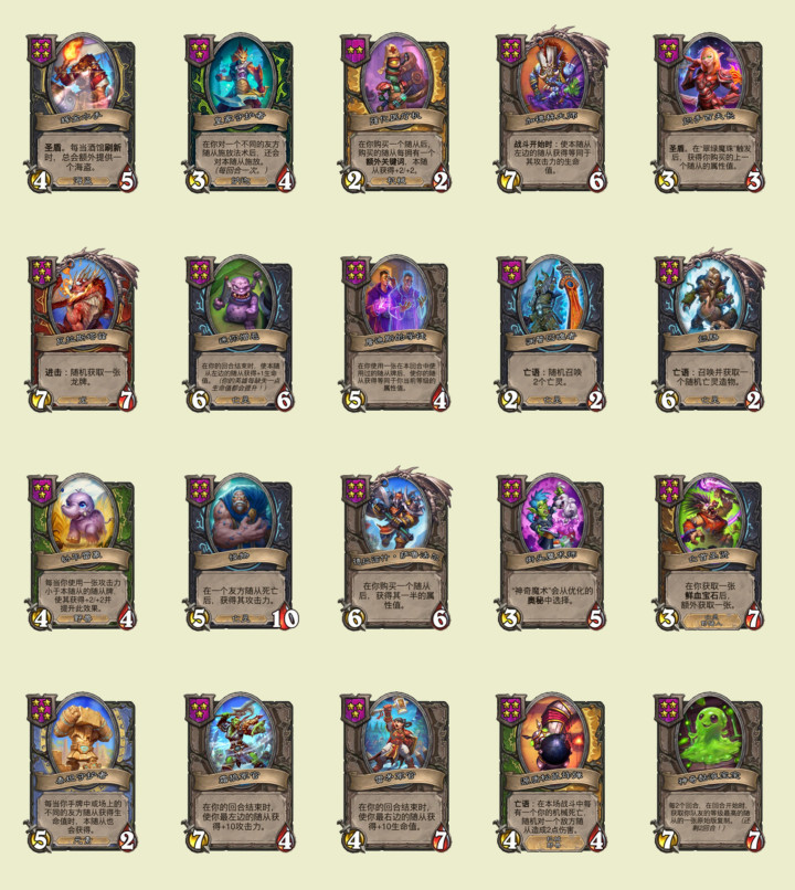 其余回归的随从分别是:诗情笔友,格雷迈恩的勇士,噬月者的勇士,烈火飞鱼,义肢假手,业报变色龙,异教徒斯瑟拉,雏龙走私商,达基萨斯将军,奥术守护者卡雷苟斯,现境大师,困倦的法师,显眼的骑手,宝石切分者,地卜大师鲁古格和遗骸看管者。奇偶体系又回归了,变色龙也回归了,连现境大师这么古早的随从也回归了。