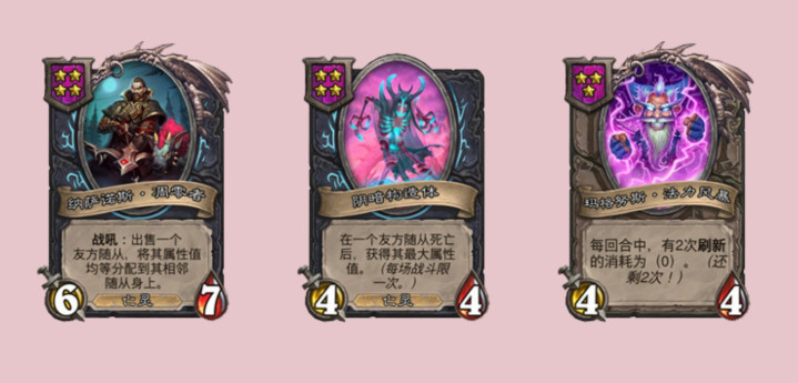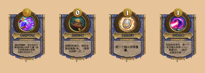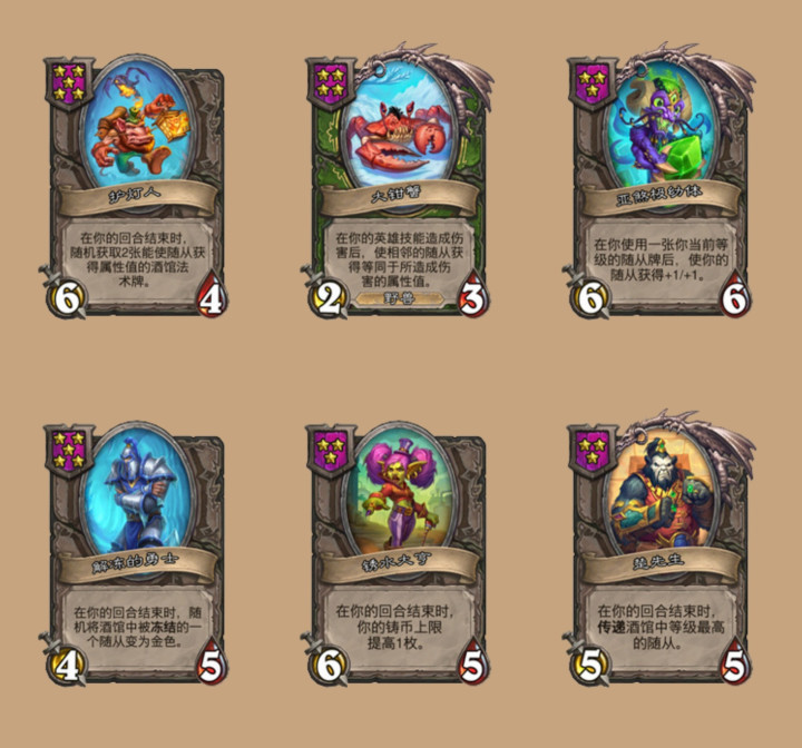 塔姆辛的技能改成战斗开始时:使你攻击力最低的随从获得“亡语:使你的其他随从获得本随从的攻击力。”,不用消灭随从了。剩下还有一些单纯的平衡调整,库拉格的技能初始效果从获得1枚铸币上调为获得2枚铸币,乔治的技能从2费下调为1费,不知道大家还记得最开始乔八爷的技能是4费吗,随着酒馆战棋数值的不断膨胀一路从4费都降到1费了……克苏恩的技能从2费使一个友方随从获得+2/+1,下调为1费使一个友方随从获得+1/+1,虽然上限变低了,但1费要比2费灵活一些。除此之外,大范现在仅出现在海盗、元素或鱼人局,塞纳留斯,厄祖玛特和恩佐斯仅限野兽局,而杰弗里斯在元素局禁用。