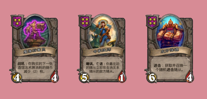 然而补丁内容还没有结束,这次酒馆战棋还对棋子进行了轮换,并且还加入了一些新棋子,魔像档案员,3星4/4,战吼:你购买的下一张酒馆法术牌消耗的铸币减少(2)枚,加强版厄运先知。专家技师,4星5/1,嘲讽,亡语:你最左边的随从立即攻击消灭本随从的敌方随从,一张能够让友方插队攻击的新卡,应该会很适合进击流派。接下来这张友方保镖,就是新的进击随从,4星6/4,进击:获取并召唤一个随机进击随从。