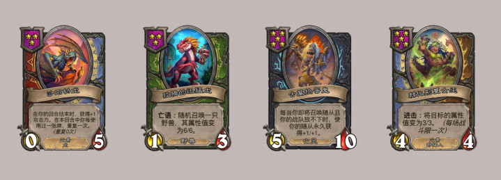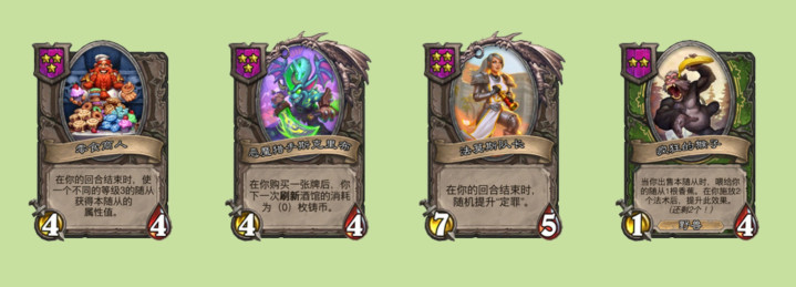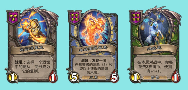 克隆大师泽里克的伙伴是3星1/1的迷你泽里克,可以选择酒馆里的一个随从变形成其复制,基本上就是凑三连用的。预言者怒波顿的伙伴是外域阳光元素,4星5/5,战吼能发现一张任意等级3枚铸币以上的酒馆法术,发现的法术很适合用来配合技能。塞纳留斯的伙伴是玛洛恩,4星1/1,在本局对战中,你每花费3枚铸币便拥有+1/+1,emmm感觉成长很慢啊,除非电表倒转,但你都电表倒转了,也不在乎这效果带来的一点点身材了……