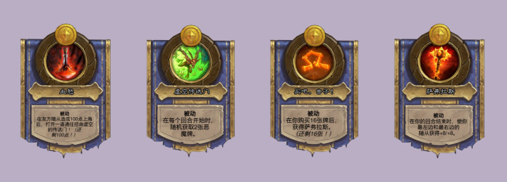拉卡尼休的伙伴上面提到过改成随机获得能使随从获得属性值的法术,技能也改成了你的能使效果获得+1/+1,可惜没有成长性。辛达苟萨的技能变成了被动,随从消耗2枚铸币,但酒馆提供的随从减少一个,并且每回合结束都会冻结,有点像另类版的米尔豪斯了。斯尼德的技能改成了开局拥有一台2/1的可以召唤你手牌中生命值最高的随从的伐木机,伐木机版拉拉鱼。希尔瓦娜斯的技能改成了2费发现上一场战斗中死亡随从的原始版复制,让希女王三连变得容易很多,不过第3回合才解锁。