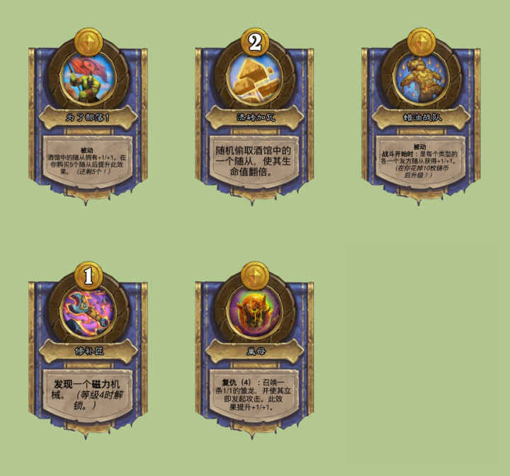 萨鲁法尔大王的被动改成使酒馆中的随从获得+1/+1,购买5个随从后提升效果,其实成长速度并不是很快,但这个被动让萨鲁法尔大王前几个回合的战力非常强,感觉可以锁住血后速本。金字塔的技能现在变成2费偷取酒馆里一个随从,并且使其生命值翻倍。瓦托格尔的技能改成战斗开始时使每个类型的各一个友方随从获得+1/+1,而这个效果在花掉10铸币后可以获得升级。机械姐米尔菲斯的技能现在改成和红龙差不多了,只不过发现的是磁力机械。奥妮克希亚的技能现在初始召唤的是1/1的雏龙,但每次触发后效果都能+1/+1,上限比之前高了很多。
