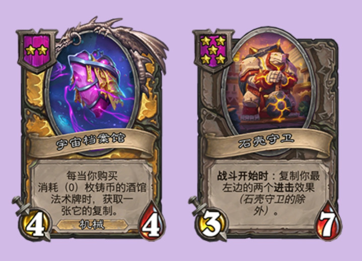 奥萨尔的伙伴是宇宙档案馆,每当你购买一张消耗为0的酒馆法术时,获取一张他的复制,可惜法术倒转的恶魔体系退环境了,不然配合阿克蒙德感觉好强。最后洛的伙伴是石壳守卫,战斗开始时复制最左边两个进击效果,另外还很谨慎的让他不能复制石壳守卫的进击效果,杜绝了套娃的可能性。