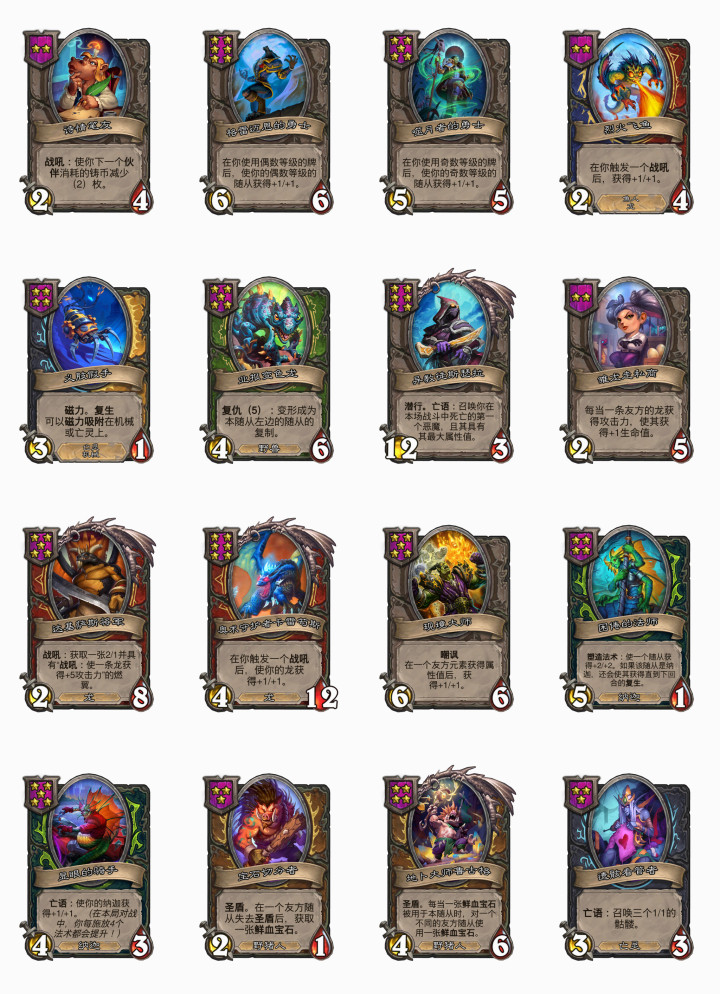 接下来是旧伙伴平衡重做,这个内容实在太多了,而且基本上每一张都是大重做,就简单聊聊了。希尔瓦娜斯的伙伴之前是把一个友方随从的身材加到相邻随从的身上,相当于能把身材翻倍,重做之后改成了把属性值均等的分配给相邻随从身上,变金之后才能翻倍,这样就合理很多了。塔隆·血魔的伙伴从亡语传身材给友方随从,变成了友方随从死亡后获得其属性值,而且还每场战斗限一次。米尔豪斯的伙伴重做后,变成了每回合有两次刷新消耗变成0费,感觉和之前购买牌后添加相同等级的牌相比,上限要降低很多。