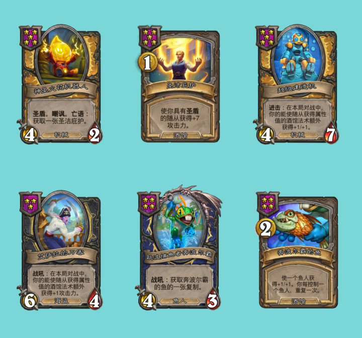 神圣火花机器人,5星4/2的机械,圣盾。嘲讽。亡语:获取一张圣洁庇护,这个圣洁庇护是之前刚出的酒馆法术,1费,使你具有圣盾的随从获得+7 攻击力。超级建造机,5星4/7的机械,进击:在本局对战中,你的能使效果额外获得+1/+1。艾萨拉的刀客,3星6/4的海盗,战吼效果让你的能使效果额外获得+1攻击力。跳波捕鱼者奔波尔霸,4星4/3的鱼人,战吼获取奔波尔霸的鱼的一张复制,而这个“奔波尔霸的鱼”是一张新的酒馆法术,4星2费,使一个鱼人获得+1/+1。你每控制一个鱼人,重复一次,吃到能使效果的话感觉很猛,这下鱼人小学生更厉害了。