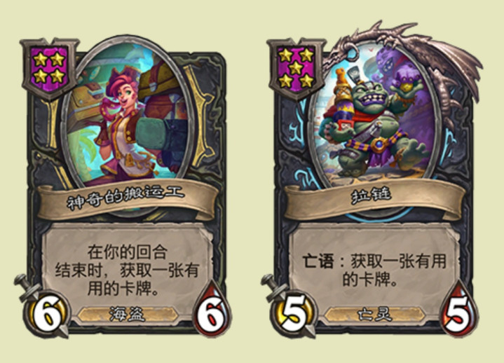 设计师为伙伴版本后推出的英雄们设计了新的伙伴,首先是马林和扣子的伙伴,马林的伙伴神奇的搬运工是4星6/6,战吼获得一张有用的卡牌,而扣子的伙伴拉链则是5星5/5,亡语获得一张有用的卡牌,根据设计师的解释,这个有用的卡牌有可能是随从也有可能是法术,效果和饰品的机制有点像,会根据你当前场面来智能的给你有用的卡牌,不过到底是真有用还是废物,有没有玩到过的小伙伴来说说体验如何?