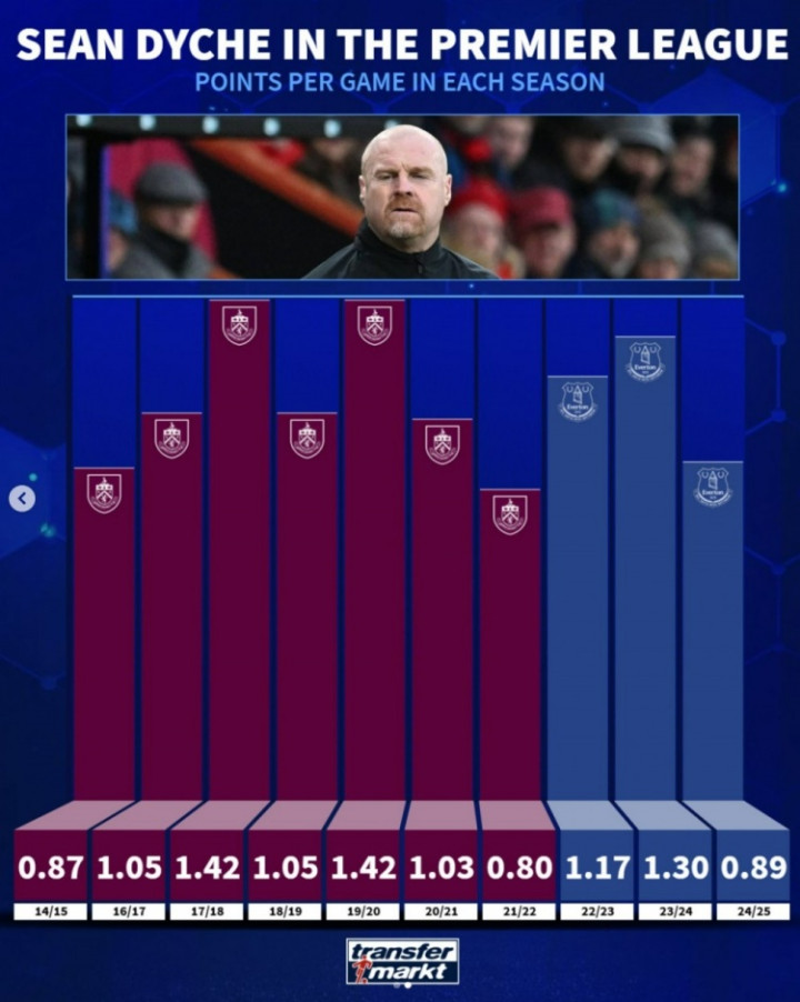 直播吧10月21日讯戴奇正式执教诺丁汉森林,德转也盘点了戴奇此前执教伯恩利以及埃弗顿在英超的赛季场均积分情况,具体如下:
