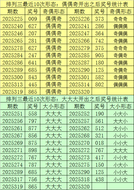 排列三最近10次同时开出奇偶形态:偶偶奇和大小形态:大大大时其奖号分别为:667-667-665-885-889-889-889-669-869-685-865,下期分别开出号码为:882-989-259-757-012-172-894-683-717-125,详细统计见下表: