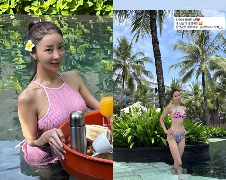 韩国喜剧演员尹正秀(53岁)的妻子元真瑞(41岁,改名前元子贤)在新婚旅行中展现了比基尼身材。