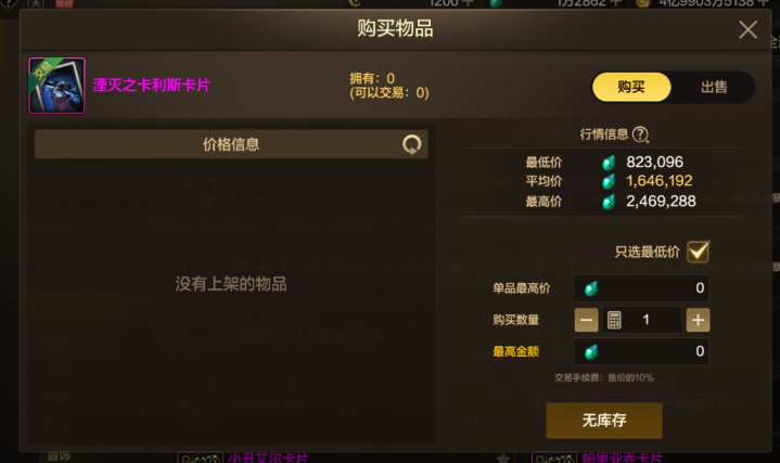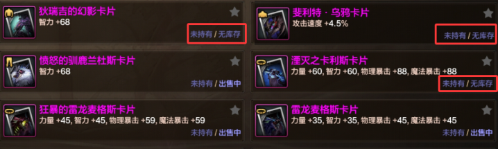 不过拍卖行也并不是万能的,有一些粉色卡片一直都是处于无库存状态,而这次也是让“无库存粉卡”火了,246万泰拉一张,能换新春双至尊。蛇卡乌鸦卡一直都是显示无库存,并不说这张卡片有多么火被抢购,而是这张卡片是真的绝版了啊。相比之下,虽然土龙卡也是显示无库存,但土龙卡并没有绝版,而是被买到无库存的啊。