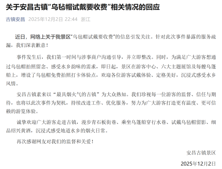 事件发生后,我们第一时间与涉事商户沟通引导,并立即整改。同时,为满足广大游客想通过乌毡帽拍照留念、感受水乡韵味的需求,即日起,景区在游客中心、六大主题展馆及每艘乌篷船上,增设了乌毡帽免费拍照打卡体验点,欢迎各位游客试戴体验、定格美好,沉浸式感受水乡风情。安昌古镇素来以“最具烟火气的古镇”为大众熟知。我们珍视每一位游客的监督、信任与期待,也将以此次事件为契机,持续改进工作、优化服务,努力为广大游客打造更有温度、更可信赖的游览体验。